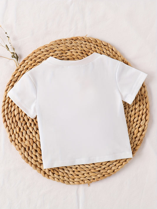 Baby Girl'S White Knit Floral Print T-Shirt - Cute Short Sleeve Round Neck Top with Colorful Flower & Butterfly Design, Soft Breathable Summer Outfit for Toddlers & Infants, Baby Girl Tshirts, Playful Toddler Wear, Comfortable Fit