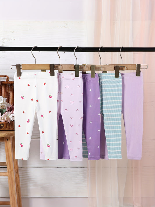 5pcs Baby's Casual Ribbed Pants, Solid Color/Stripe/Flower/Rainbow/Cherry Pattern Elastic Waist Trousers, Toddler & Infant Girl's Clothing For Fall Spring