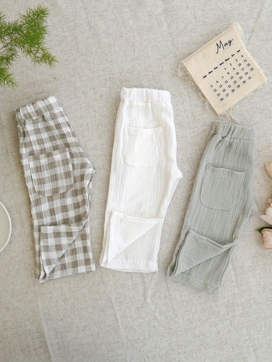 3pcs Soft Cotton Muslin Pants Set for Babies & Toddlers, Plaid Casual Trousers with Pockets, Machine Washable, Perfect for Outdoor