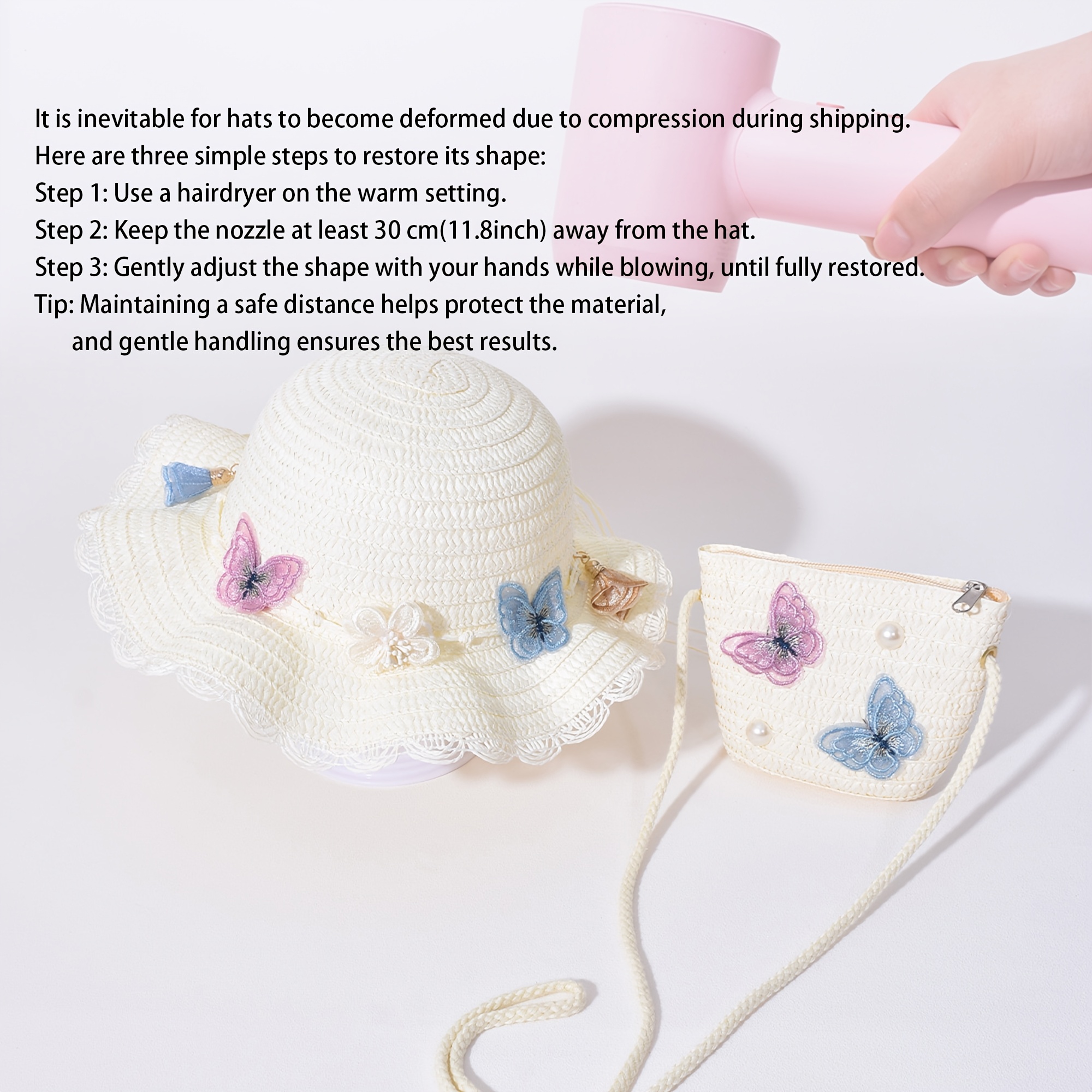 2pcs Girls' Butterfly and Floral Hat and Crossbody Bag | Breathable Sun Protection, Lightweight, Windproof with Carrying Strap, Ideal for Outdoor Summer Beach Parties and Holidays