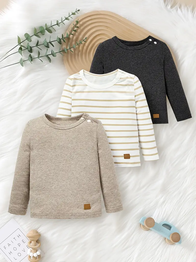 🌟 Your Little One's Essential Look for Playtime! – Introducing our Boys' Spring & Fall Long Sleeve Striped Top Set! Crafted from a soft knit fabric that combines comfort with style, this 3-piece casual outfit features trendy brown button details, perfect for outdoor adventures or family outings. 💚 Why you need it: - Ideal for active toddlers: The long sleeve design keeps them warm during chilly spring and fall days. - Easy to clean: Machine washable fabric makes laundry a breeze, ensuring your child looks sharp after every playdate. - Versatile styling: Dress it up or down, this outfit can transition easily from casual play to family gatherings. ❤️ Why you’ll love it: - Soft, breathable knit fabric provides all-day comfort for your little explorer. - Fun stripes add a stylish touch that kids will love, making it their go-to outfit. - Durable quality ensures it withstands all the rough and tumble play. 🛠️ How to use it: Simply dress your child in the top with their favorite pants or shorts. Ideal for layering with a jacket on cooler days. ✅ Satisfaction Guarantee: Get your boys’ outfit set today and equip them for every adventure! This exclusive deal won't last long—snag it now and let your little boy step out in comfort and style!